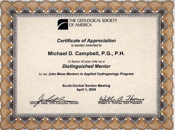 **** Distinguished Mentor for the John Mann Hydrogeology Program, GSA South-Central Meeting, Trinity University, April 1, 2005 (here).