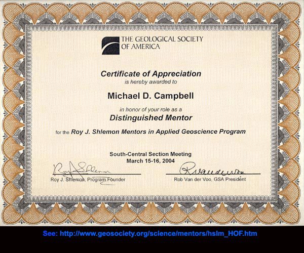 **** Distinguished Mentor for the Roy J. Shlemon Applied Geoscience Program, GSA South-Central Meeting, Texas A&M University, March 15-16, 2004 (here).