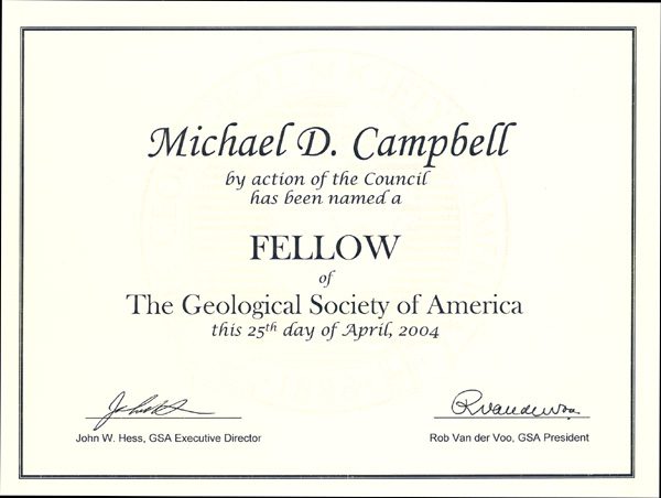 April, 2004 – Michael D. Campbell elected Fellow by Geological Society of America. Inducted in November at GSA’s Annual Conference in Denver, Colorado.