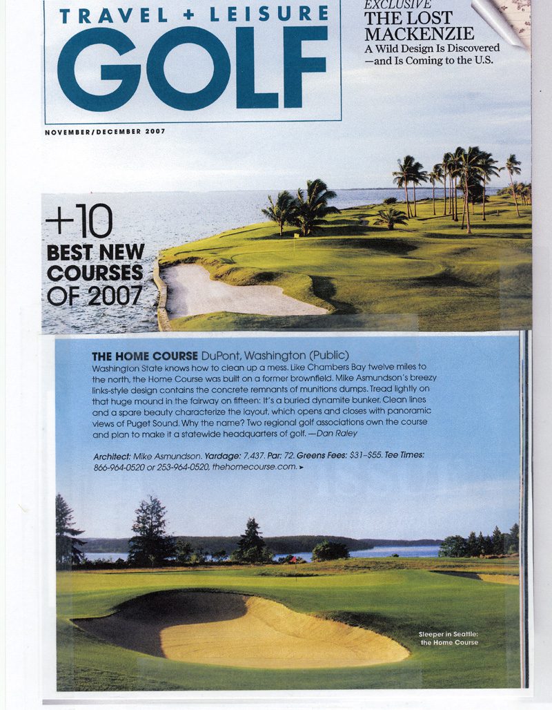 One such environmental project managed by I2M’s Jeff King involved the environmental clean-up of an industrial site in the vicinity of DuPont, Washington. Once the contaminants were removed, Mr. King oversaw the construction of a golf course followed by the construction of quality homes. The golf course was completed in 2006 and has just won the “Top Ten New Courses in the World” Award for 2007, given by Travel and Leisure Golf Magazine (See Announcement (here)).